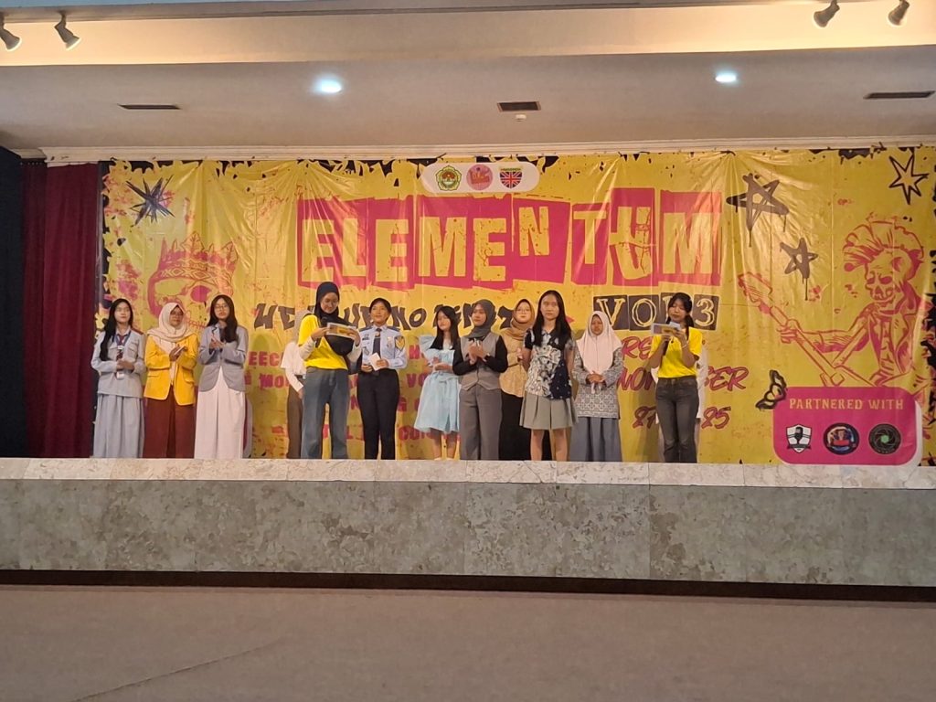 Kegiatan ELEMENTUM Vol. 3 kembali digelar dengan penuh semangat dan kreativitas. Acara ini menjadi wadah bagi para pelajar untuk mengekspresikan kemampuan dan potensi diri melalui berbagai kompetisi yang menarik dan menantang. Mengusung tema “He Who Destroys a Good Book, Kills a Reason” yang terinspirasi dari kecintaan terhadap literasi, seni, dan komunikasi kreatif, ELEMENTUM menghadirkan pengalaman berbeda bagi para peserta untuk merayakan kemampuan berbahasa Inggris sekaligus menumbuhkan rasa percaya diri di atas panggung.