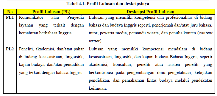 Profil Lulusan program studi merupakan penciri atau peran yang dapat dilakukan oleh lulusan di bidang keahlian atau bidang kerja tertentu setelah menyelesaikan masa studinya. Profil Lulusan program studi Bahasa dan Kebudayaan Inggris adalah seperti yang tercantum pada tabel di bawah ini: